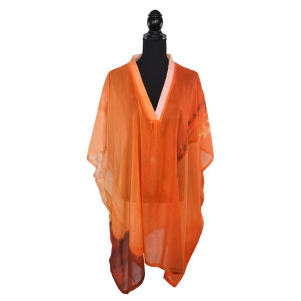 An abstract color wash design gives this short kaftan cover-up wide appeal. Generously sized with a wide-seamed, deep v-neckline, this cover-up is a super light and colorful topper for your next seaside escape. Material: 55% cotton, 45% modal. Measures: W 42 in x L 34 in.